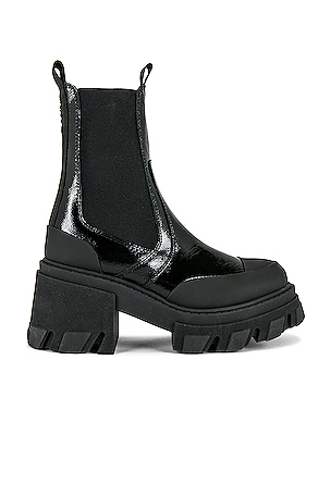 Made en Portugal. Forme à enfiler avec empiècements élastiques. Ganni BOTTen. ES MID CHELSEA en Noir. Size 36, 37, 38, 39, 40. Dessus cuir verni et textile semelle synthétique.