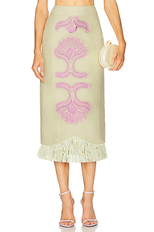 Lenen fabric with embroide. Rouge design at front and raffia trim. AXIS WQ162. A1250902 0327. N en Sauge. Taille XS.