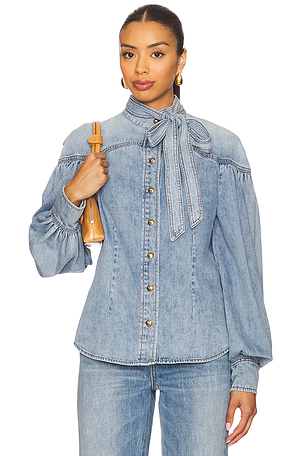 Denim Tie Neck Blouse en Bleu