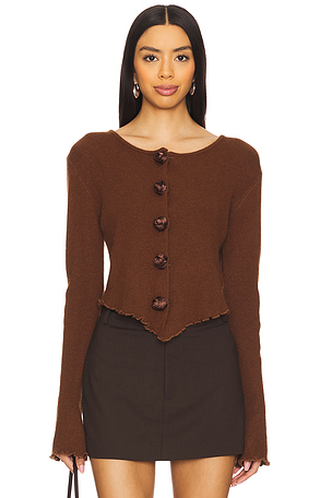 BUBR WK19. Rosetteknitcardigan. TTE en Chocolat. Size 25% cachemire, 8% laene, 27% viscose, 40% polyamide. Fermé devant par boutons pression. Rosette saten.