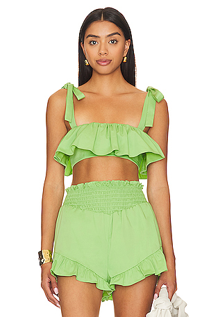 69% coton, 28% polyamide, 3% Lycra. Fabriqué en Chine. Attaches d''épaule réglables. Lightweight poplin fabric with ruffle fabric overlay. Camila Coelho Brittany Crop Top in Green. Size S, XL, XS.