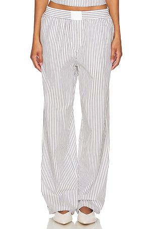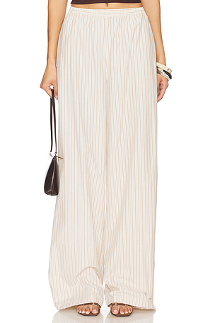 Size 10, 4, 6. Composition: 36% len, 34% viscose, 30% coton. L'AGENCE PANTALON LARGE Ken. GSTON en Blanc. Style à rayures devant et dos. Tissu len semi léger.