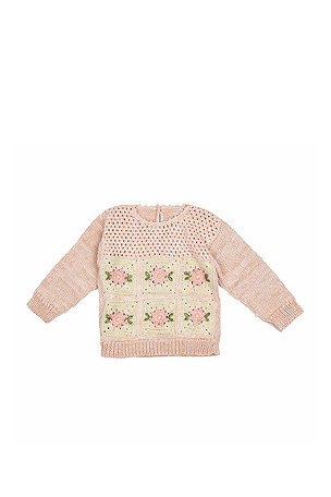 Size 12/24, 2/3, 3/4. 60% coton, 40% bébé alpaga. WWAW GK9. PATCHWORKSWEATER. Crochet design. Patchs floraux brodés.