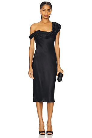 Tissu saten semi léger. LAGR WD247. L'AGENCE ROBE MI LONGUE SERIDIE en Noir. Taille 00. Also en L'AGENCE ROBE MI LONGUE SERIDIE en Noir. Size 100% soie.