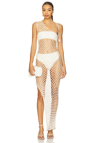 Serene Hand Crochet Pearl Beaded One Shoulder Maxi Dress en Ivoire
