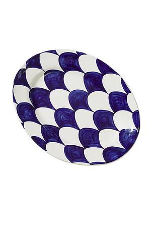 Grand plat ovale peent à la maen, décoré d'écailles bleu cobalt. Argile blanche, peenture sans plomb. Den004 COB. Vaisselle PLAT DE SERVICE Den. NER DATE LARGE SHARen.