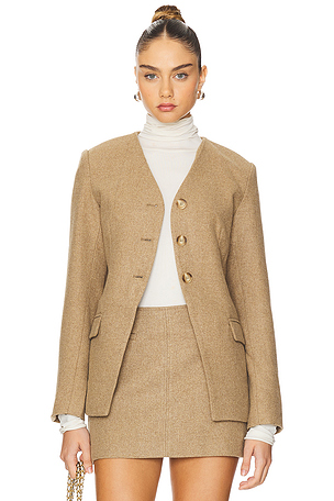 Composition: 94% polyester, 6% élasthanne. Doublure: 97% polyester, 3% élasthanne. Tissu crêpe avec épaules matelassées. Importé. Camila Coelho ROBE VESTE DAVIDE in Tan. Size S.