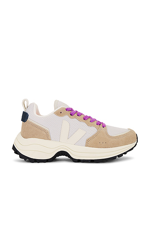 Ture sur les empiècements extérieurs. Logo Veja sur la languette. Padded low cut collar. Tirette au dos. Size 35, 36, 37, 38, 39. Dessus textile, mesh daim et semelle en caoutchouc d'Amazonie.